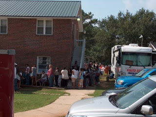 We went to food bank and picked up a load of groceries, Port City Church of Christ was here conducting a 1 day vacation bible school and Partnership for Prescription Assistance is setup helping people with their needs. They will be here for 3 days. Also 7 people from Americorps arrived last night and will be here for 10 weeks helping the food bank and the Hemley Road Church of Christ. Photo is of PPA helping the people. Also cooked 90 corndogs for the kids.